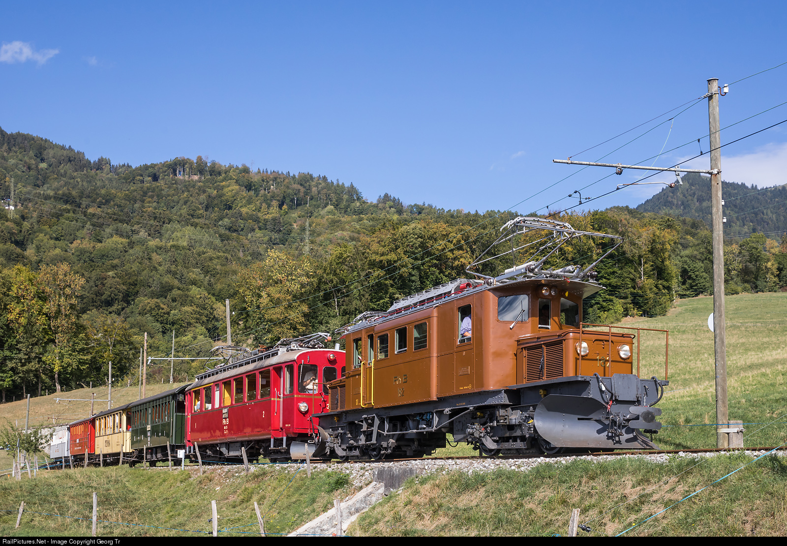 | "Bernina Crocodile" Ge 4/4 # 182, built in 1927 by SLM and SAAS for the then independent Bernina Railway and now runing for the RhB, is trailing locomotive in front of a passenger train pulled by railcar ABe 4/4 # 35 of the Blonay-Chamby Railroad Museum near the Cornaux stop. |