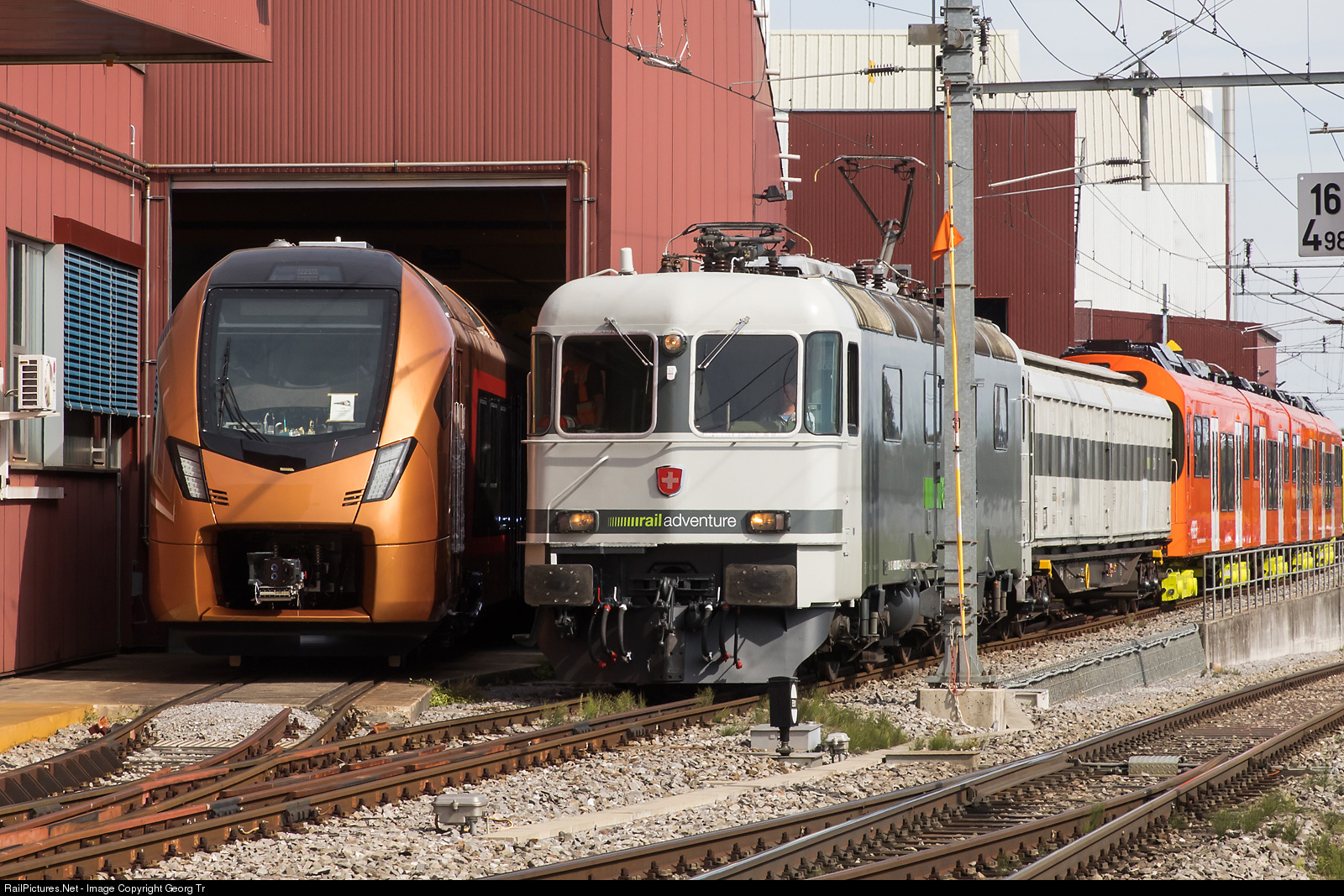 The Railadventure company bought from the SBB the former Re 6/6 # 11603 "Wädenswil", one of the 4 prototypes of the series, built in 1972 by SLM, BBC and SAAS. Now it is in service in a brand new paint scheme and designated Re 620 # 003 "Schweiz Svizra Suisse Svizzera". The locomotive will be used mainly for transfer runs of brand new vehicles from the works to the costumers or to test sites, for example for StadlerRail. Here it is ready for departure at Bussnang, pulling (behind a coupling car) the one meter gauge trainset Be 4/10 "Worbla 02" for the RBS (Regionalverkehr Bern-Solothurn), which is loaded onto 5 Loco Buggies, specially built by RailAdventure for this purpose. This brand new vehicle from StadlerRail will go to Berlin for the Innotrans exhibition. On the left a RABe 526 "Traverso" of StadlerRail for the Südostbahn in the production process.