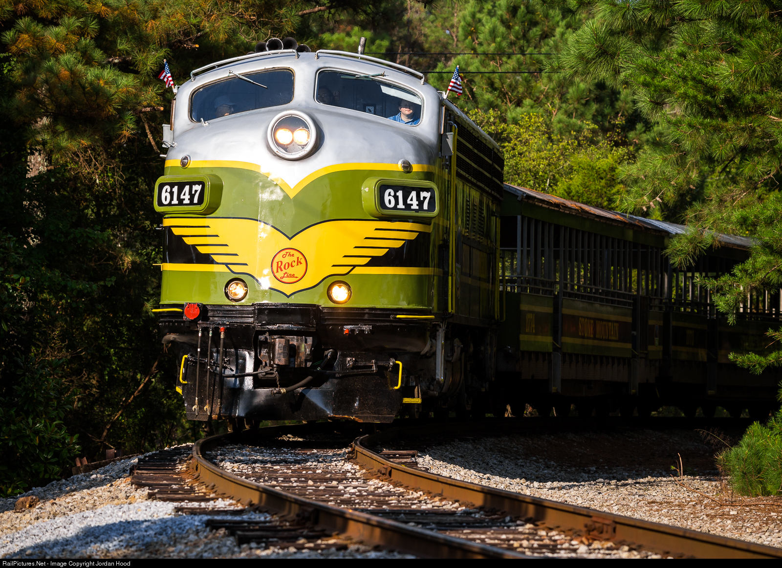 Train 100 emerges from the shadows as they approach the Walk-Up Trail crossing. The empty train is on its way to the shop to tie up after pulling guests around the rock on the annual Yellow Daisy Festival weekend.