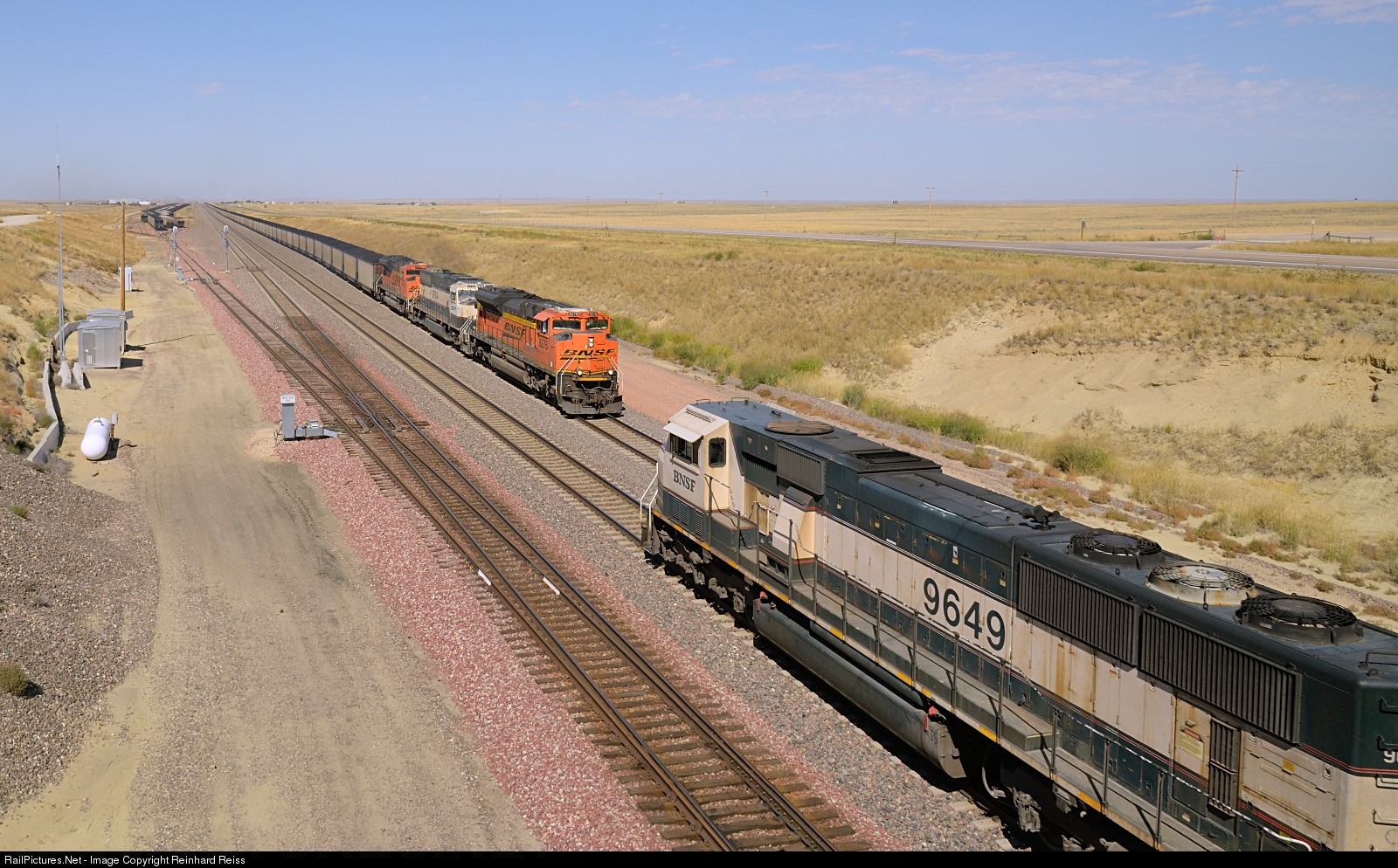 BNSF 9278 (SD70ACe), 9704 (SD70MAC) & 9256 (SD70ACe) with a southbound loaden coal train meet BNSF 9649 (SD70MAC) with a nortbound empty south of Bill (WY).