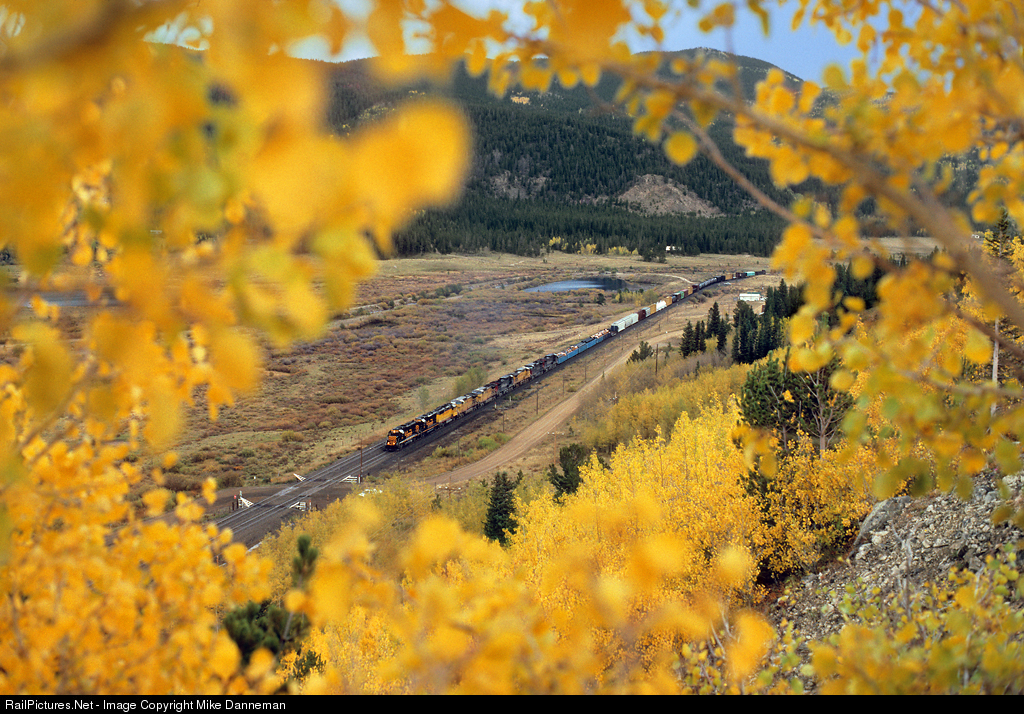 Union Pacific’s Denver to Salt Lake City freight MDVRO works upgrade through golden autumn color at Tolland, Colorado, on September 29, 1998. All three former Rio Grande GP60s are in the lead, although the big road from Omaha has already painted the 3156 yellow and renumbered it 5702. Following the GP60s are six GE AC4400CWs in both Southern Pacific and UP schemes.