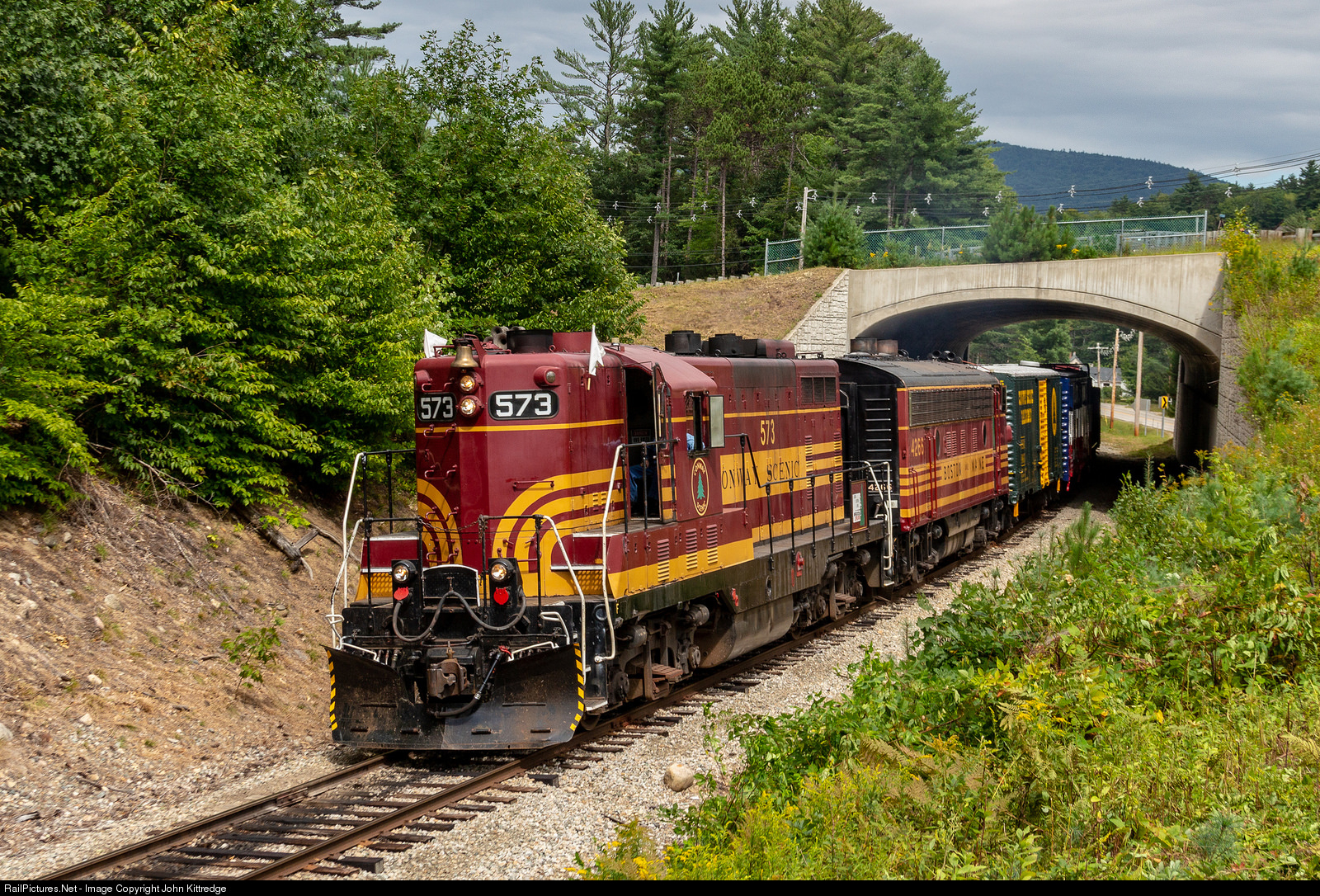 | Conway Scenic's former Maine Central GP7 573 and former Boston and Maine F7 4266 lead a photo freight through the unique tunnel/bridge where Route 302 passes over the tracks at Cook's Crossing near Bartlett, NH |