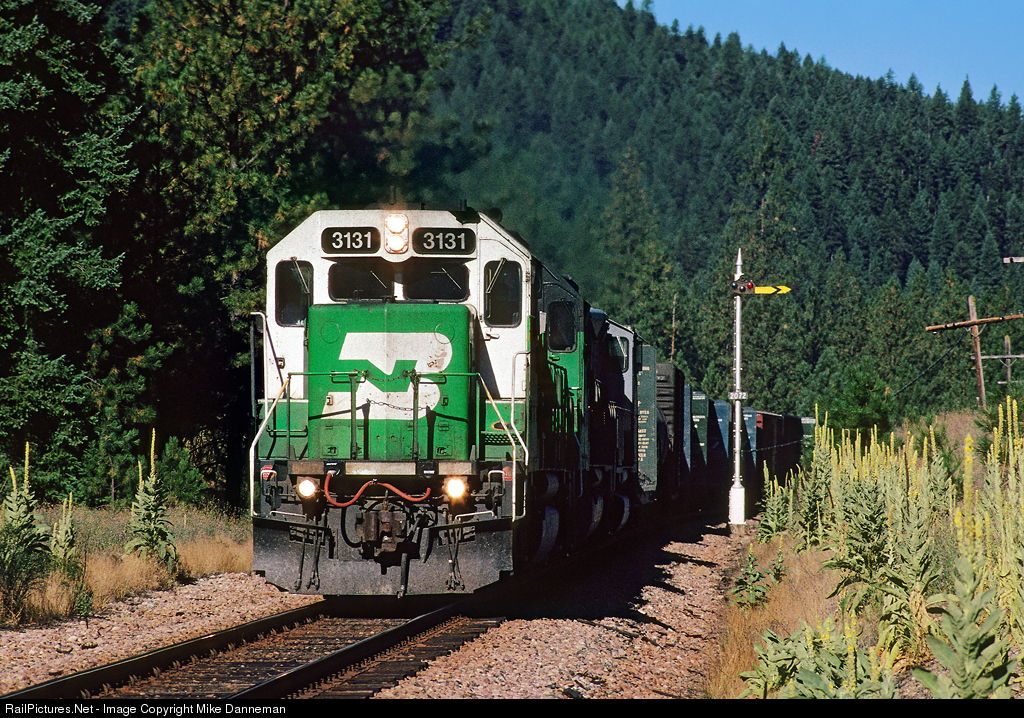 Burlington Northern EMD GP50 No. 3131 leads westbound train 125 past the mile 207.2 semaphore on Montana Rail Link’s Fourth Subdivision main line between St. Regis and Paradise at Donlan, Montana, on August 12, 1996.