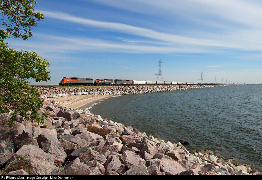 On the afternoon of August 31, 2018, Dakota, Missouri Valley & Western’s “wayfreight” passes milepost 490 between Coleharbor and Garrison, North Dakota, crossing the long causeway separating Lake Sakakawea from Lake Audubon on this section of the Missouri River backed up by the Garrison Dam.