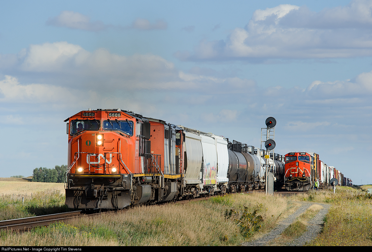 CN SD70I 5606 screams over the west switch at McGregor with train M315 in tow. They're seen passing train X403 who will follow them out, only to be recrewed at Watrous.
