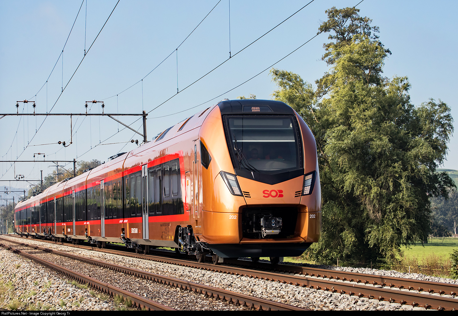 | First test run of a new TRAVERSO from StadlerRail for the Südostbahn (SOB) between Sulgen and Erlen. This 8 car "Flirt 3" RABe 526 # 102/202 will run as Voralpen-Express between St.Gallen and Lucerne from december 2019. The train is 151 meter long, has 359 seats (68 in first class) and a maximum velocity of 160 km/h. For the Voralpen-Express were 6 trains ordered, and 11 more for the traffic between Basel/Zürich via Gotthard mountain line to Locarno in cooperation with the SBB from December 2020. |