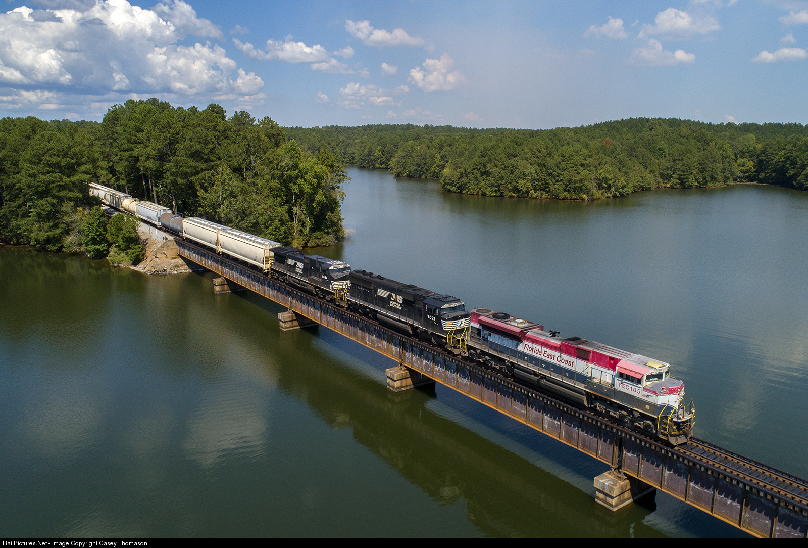 NS mixed freight train 198 crosses Lake Martin, along the Tallapoosa River, near Alexander City, AL, with leased Florida East Coast SD70M-2 #105 leading
