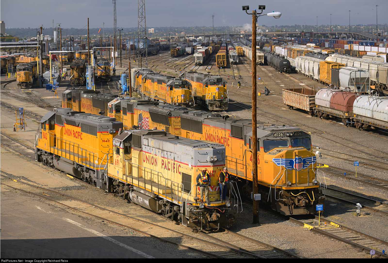 The remote control crew of UP 691 (EMD GP38-2) repositions in the UP North Yard of Denver. Various other locomotives are waiting for her next duty or just finished one.