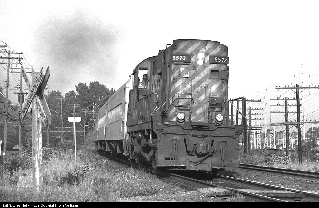 With a puff of Alco smoke, Canadian Pacific RS-10 8572 accelerates an outbound commuter train away from the stop at Valois, Quebec, en route from Montreal's Windsor Station to suburban Vaudreuil.