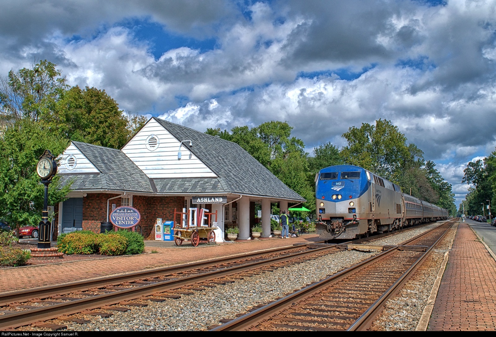 | Amtrak's southbound Palmetto passes the historic depot in downtown Ashland, VA on the CSX RF&P Subdivision. As well as serving as the Ashland Amtrak station, the depot is also used as a welcome center and a nice place for railfanners to relax and watch trains. |