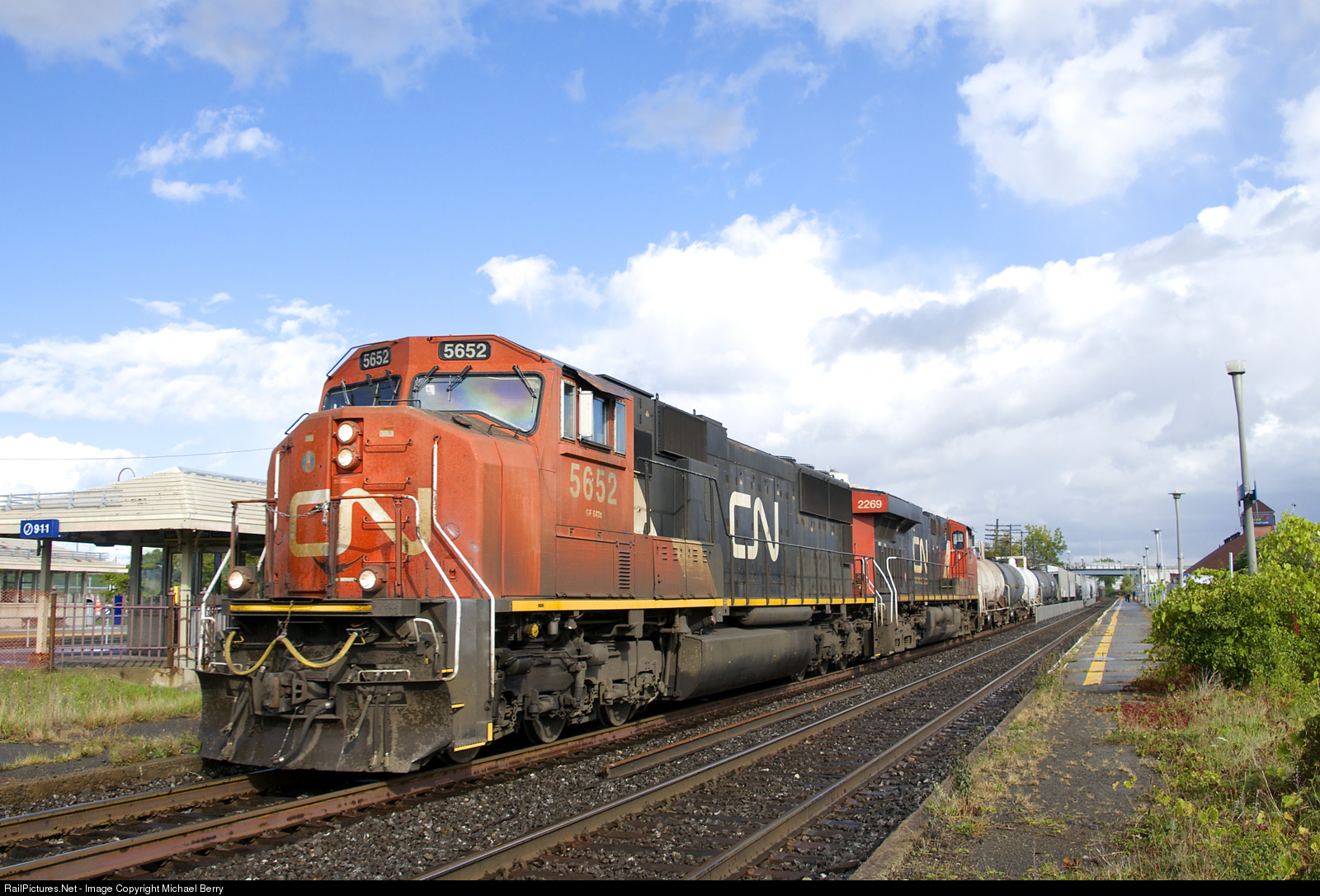 | CN 5652 & CN 2269 are the power on CN X321, seen passing Dorval Station just as the sun comes out after a downpour. This as-needed train originates at Southwark Yard and often lifts more cars at Coteau, which was the case with this edition. |