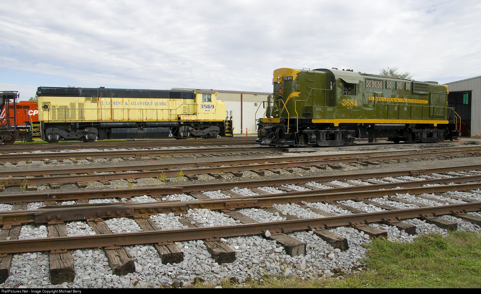 | After being used in the 'steel challenge' at Exporail (where teams of twenty people competed to see who could pull it the furthest), MLW RS-18 CN 3684 is parked, with M-420W SLQ 3569 nearby. |
