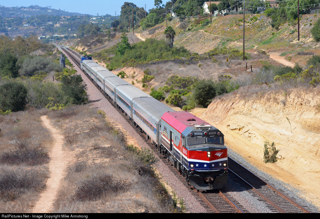 | A Veteran Hill Climber: By this point, Amtrak 90208 is no stranger to Miramar Hill. This cab control car that started off life as an F40PH locomotive has been a regular on Pacific Surfliner trains since 2006 and today, it proudly shows off its eye catching red white and blue paint scheme commemorating U.S. veterans. |