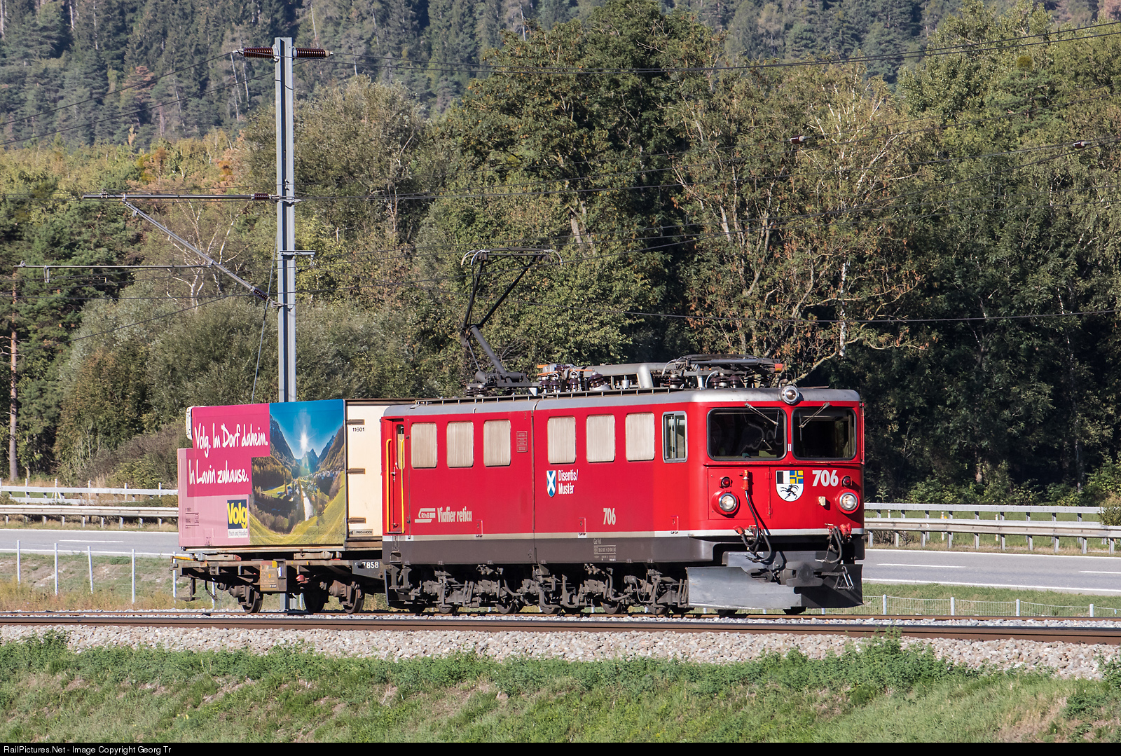 | Ge 6/6 II # 706 "Disentis/Mustér" with the very short freight 5120 from Samedan to Landquart, running about one hour ahead of schedule, between Felsberg and Chur. The container car Lb # 7858 has a VOLG (retailer) reefer container loaded. |