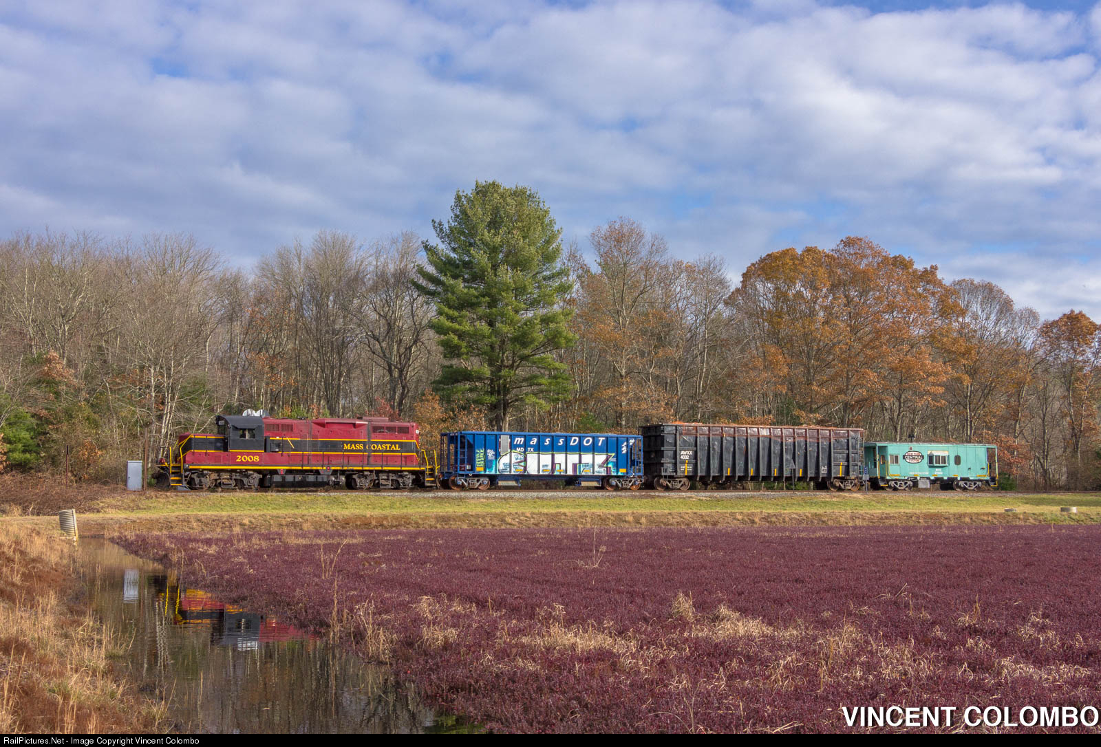 | MC 2008 leads a colorful freight train through Middleboro past a cranberry bog. The New York Central caboose once was on display at the railroad museum in Fall River, but now is privately-owned and is used by the Mass Coastal Railroad as a shoving platform for ballast trains. |