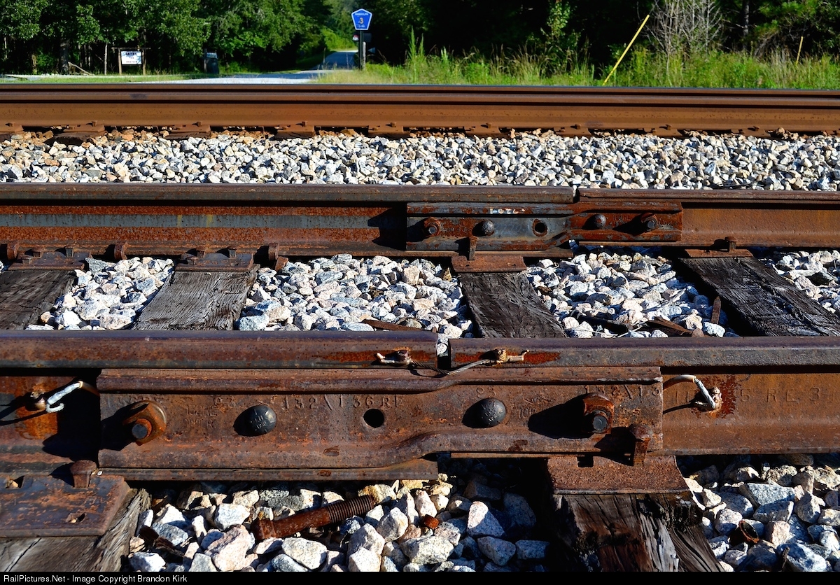 | What do you do to make two different things come together and work as one?... "COMPROMISE" That's exactly what is done to join two different size rails. A 136 lb rail and 100 lb rail are connected here by a compromise joint. These joints installed in the house track see little action opposed to the mainline in the background. |