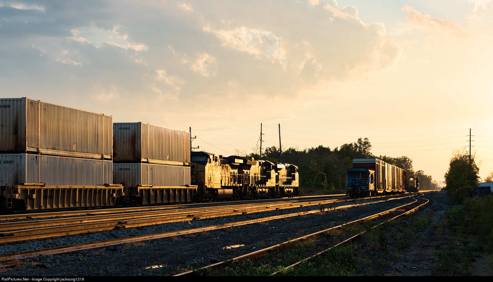A hotshot intermodal flys past CSX 2033 as it switches a lumber plant in Buffalo NY.