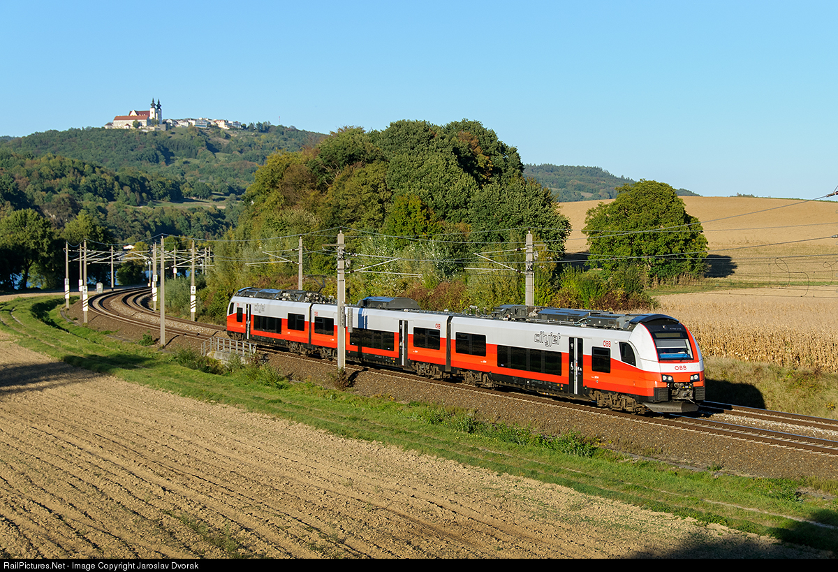 | Regional train ÖBB 4744.519 passes through the town of Diedersdorf. In the background is the pilgrimage basilica Maria Taferl, the sacred site of the Lower Austrian landscape. |