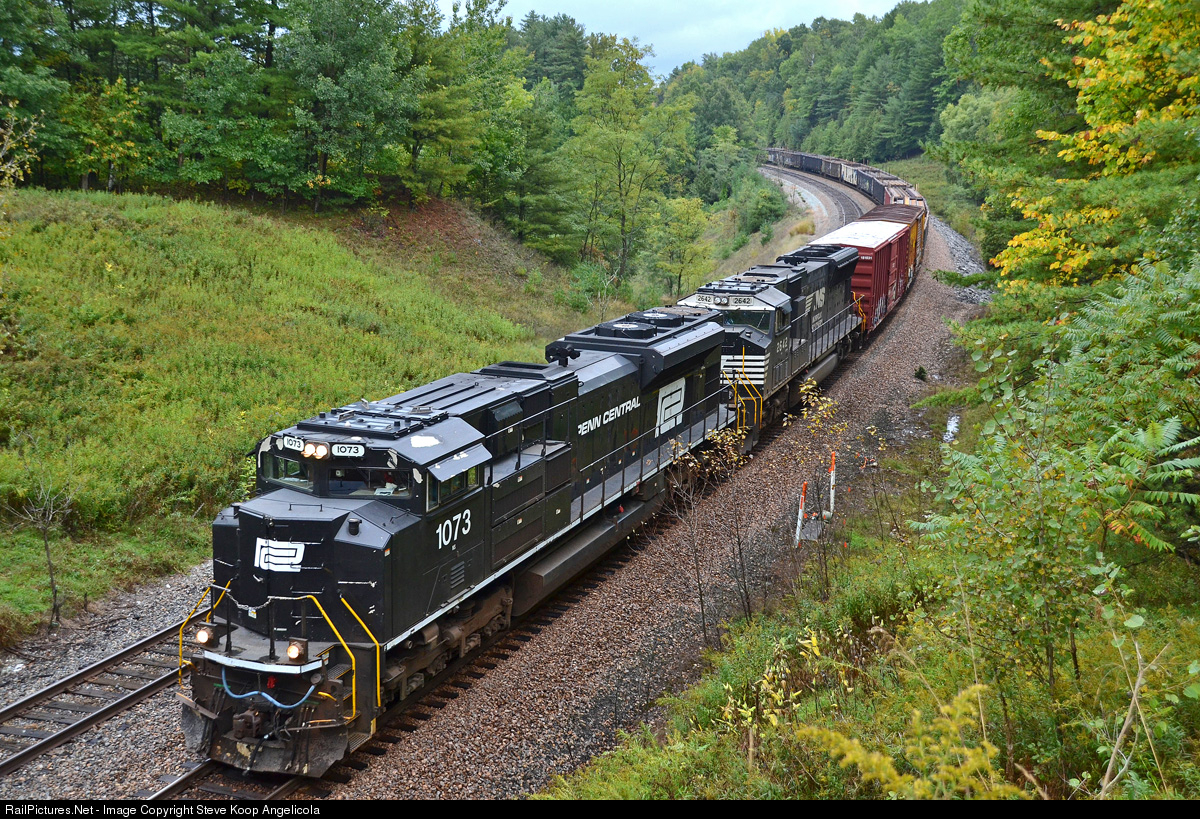 | The Penn Central heritage unit leads CP/NS 931 past the Rockland siding at Port Douglas, NY on a rainy first day of October in the Adirondacks. |