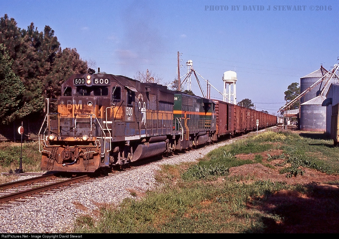| HATX GP40-2 No500 ran better than it looked, built for B&M it wound up on Gulford then to Helm under HATX. A batch of three from this group were eventually purchased by Georgia Florida RailNet. 500 leads GF87 here at Bridgeboro, Georgia during it's trip from Albany to Valdosta. (Slide Scan) |