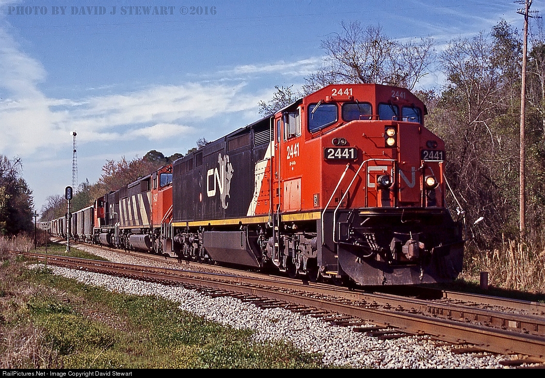 NS 151 OS's Sparks, Georgia on the GS&F District with a trio of CN motors, a C40-8M, SD50F and SD75. Sparks, Georgia is the only CTC controlled CP on the GS&F which is where the Georgia Florida RailNet heads west for Albany seen in the foreground. The Georgia Florida RailNet is also the original remaining route of the Georgia & Florida from Nashville, Georgia west via this location to Moultrie. Prior to the 1960s takeover by Southern Railway of the Georgia & Florida, there was diamond located here with the GS&F. (Slide Scan)