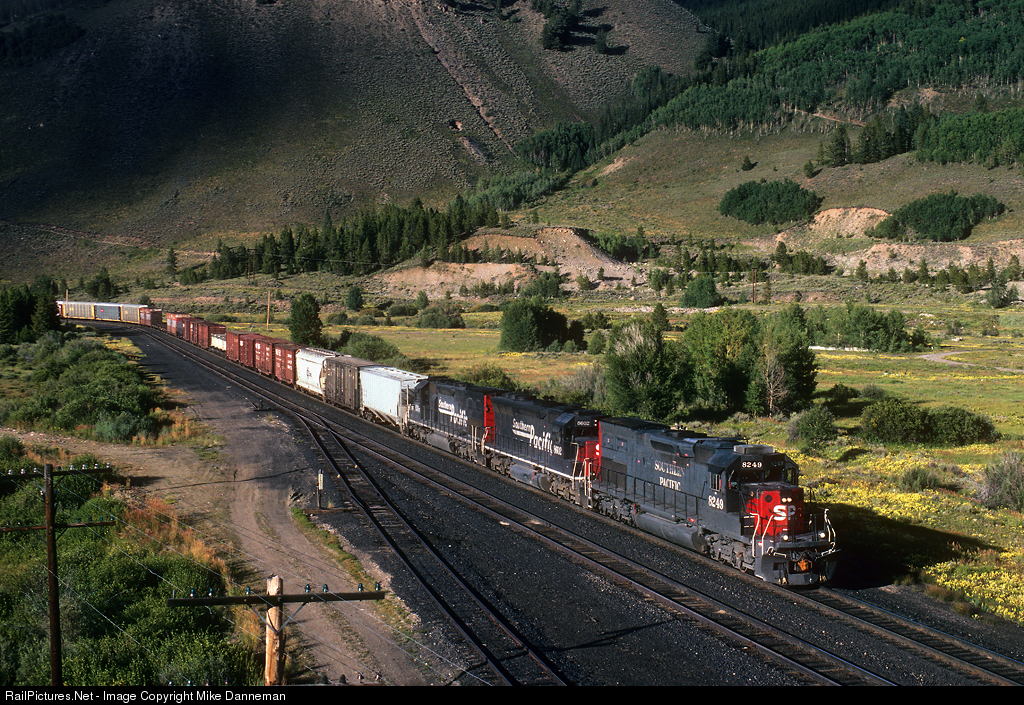 | Led by Southern Pacific EMD SD40T-2 No. 8249, a SP freight climbs Tennessee Pass at Pando, Colorado, on the afternoon of September 4, 1995. |