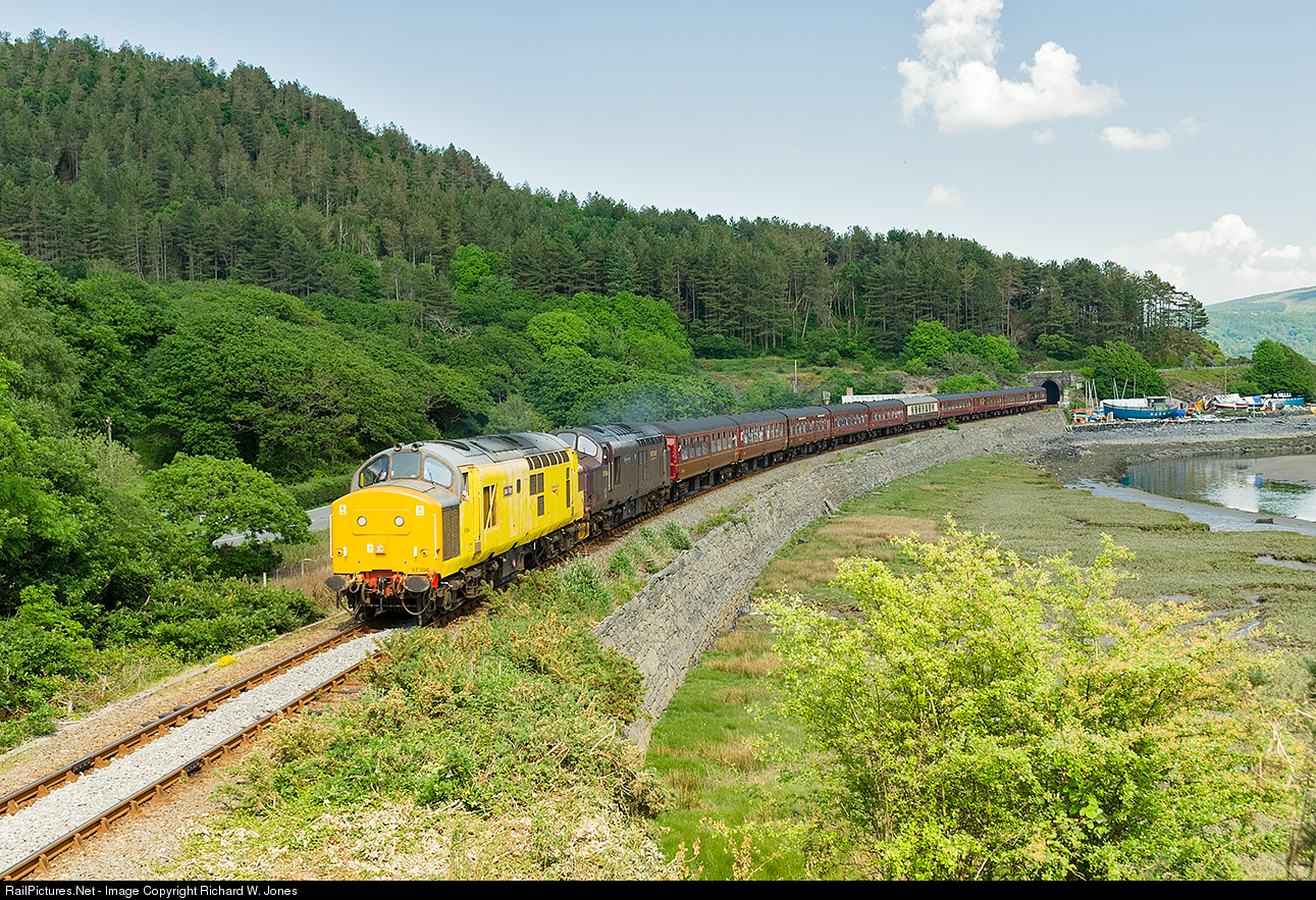 97304 “John Tiley” and 37516 “Loch Laidon” pass the boatyard at Frongoch with day 1 of Steam Dreams‘ 1Z45 08:31 Paddington to Pwllheli “The Cambrian Coast Express.” A rogue cloud came along, but thankfully I got 97304 in some sun. 1Z45 was scheduled to have a 40 minute recess at Mach, but this got amended on the day for a 5 minute stop. In oractice, it stopped at the station for 15 minutes, allowing me to leapfrog it.