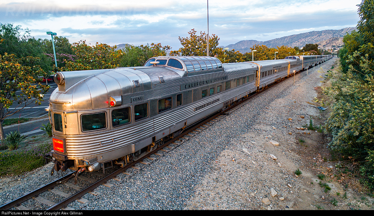 | Cooling their brake shoes during the Coast Starlight's brief stop in Simi Valley, the iconic trio of CB&Q California Zephyr private cars look sharp as their stainless steel fluting catches the setting sun's light on a warm, summer's evening. |