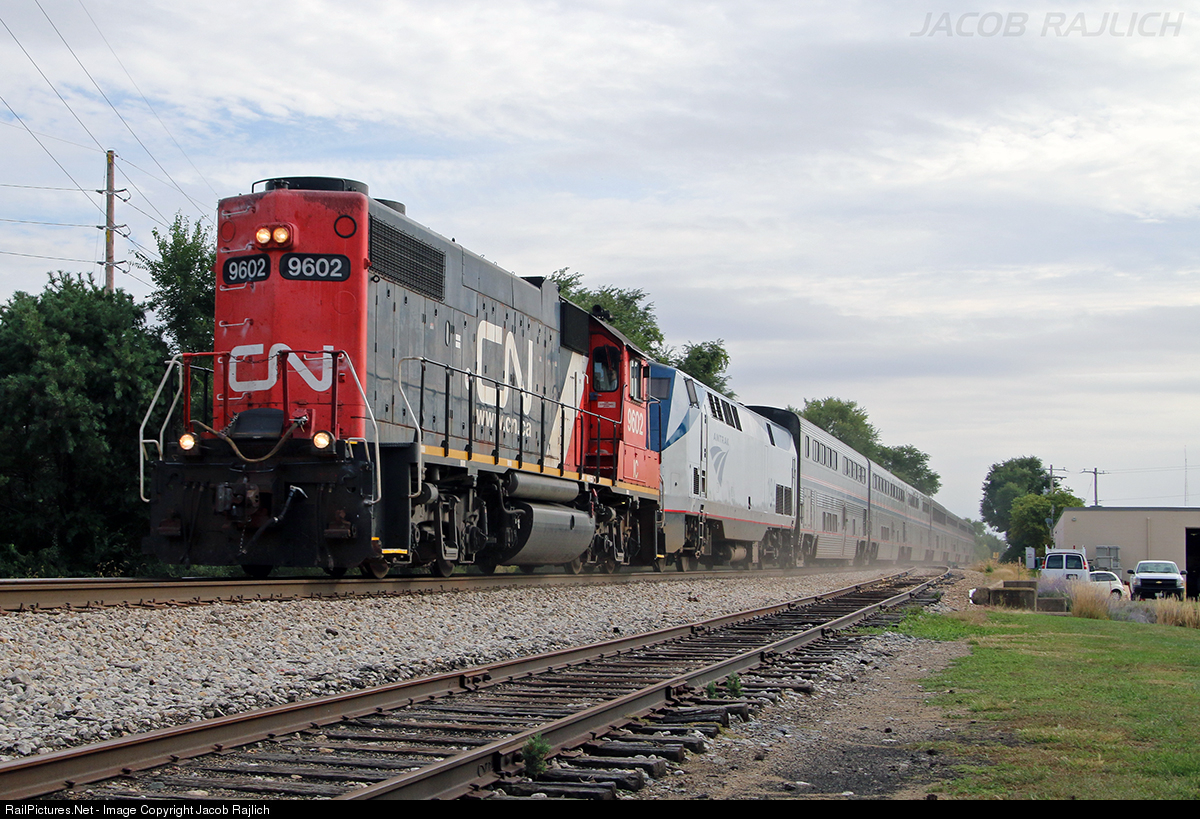 | IC GP38-2 9602 leads Amtrak's City of New Orleans north through Champaign nine hours late, being the victim of locomotive troubles earlier in its trip. |