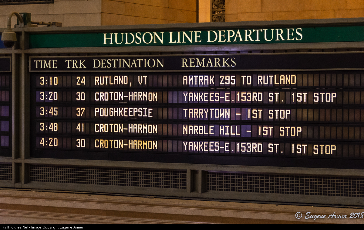 At Grand Central Terminal in New York City, Amtrak train 295, the Ethan Allen Express to Rutland, VT is top of the board for the Hudson Line departures on this Sunday afternoon. This was a common occurrence this past summer, between Memorial Day and Labor Day weekends, while Amtrak Empire Service trains were diverted from Penn Station to allow much needed maintenance at Penn Station and also the Spuyten Duyvil swing bridge on the West Side connection.