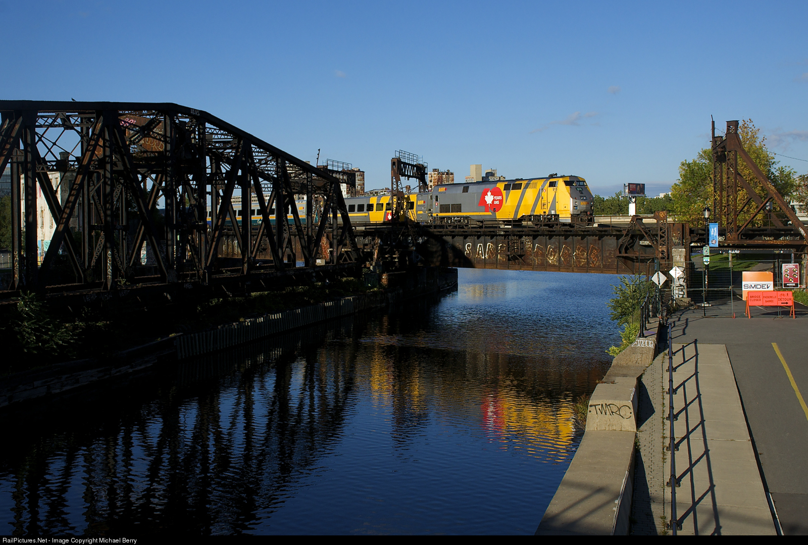 | VIA 918 casts a partial reflection in the Lachine Canal as it pushes VIA 64 towards its final destination of Central Station in Montreal. Up front is another P42DC wrapped for VIA's 40th anniversary, VIA 900. |