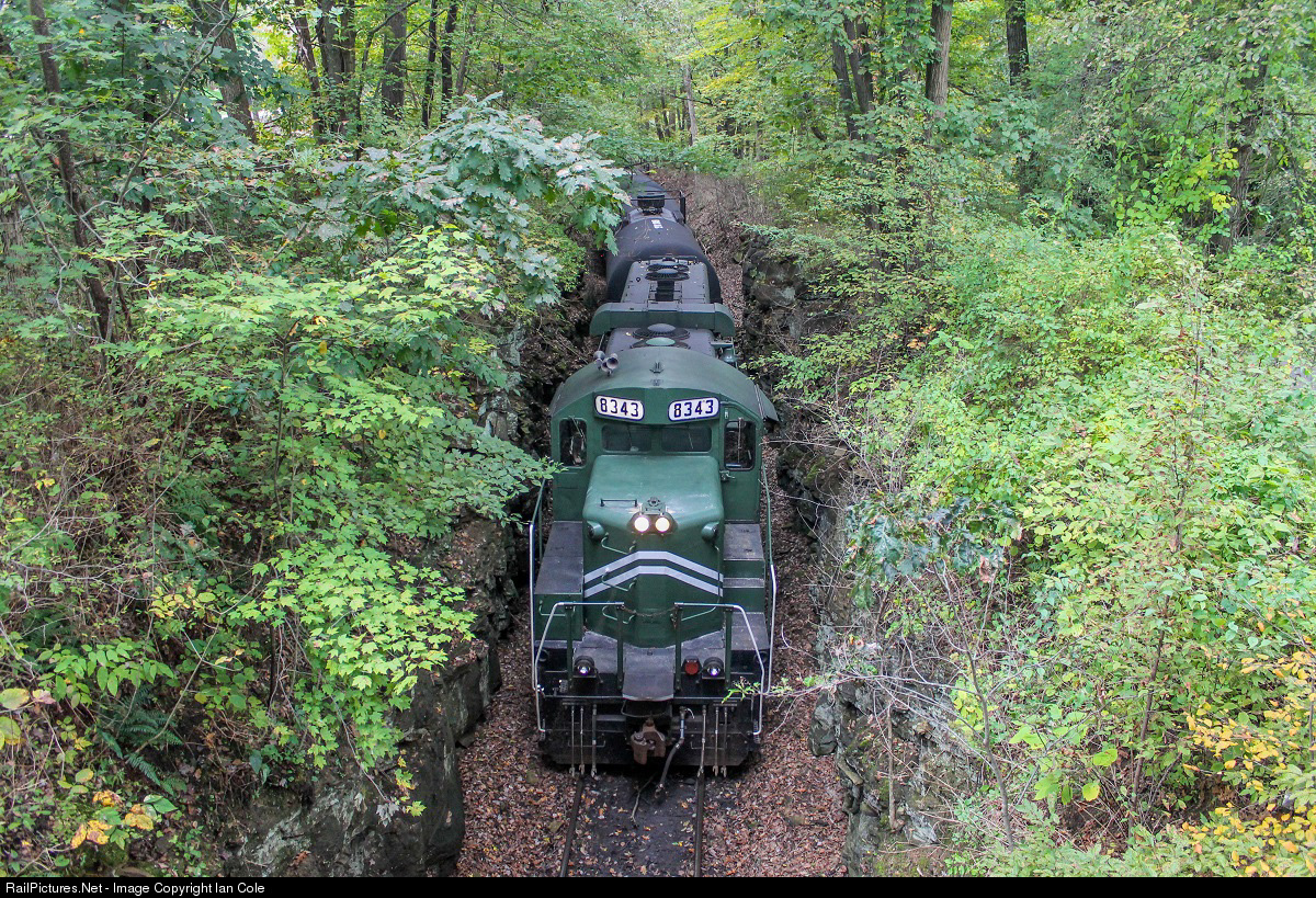 IBCX 8343 leads the construction and demolition train through Frederick Cut en route to Negley, Ohio