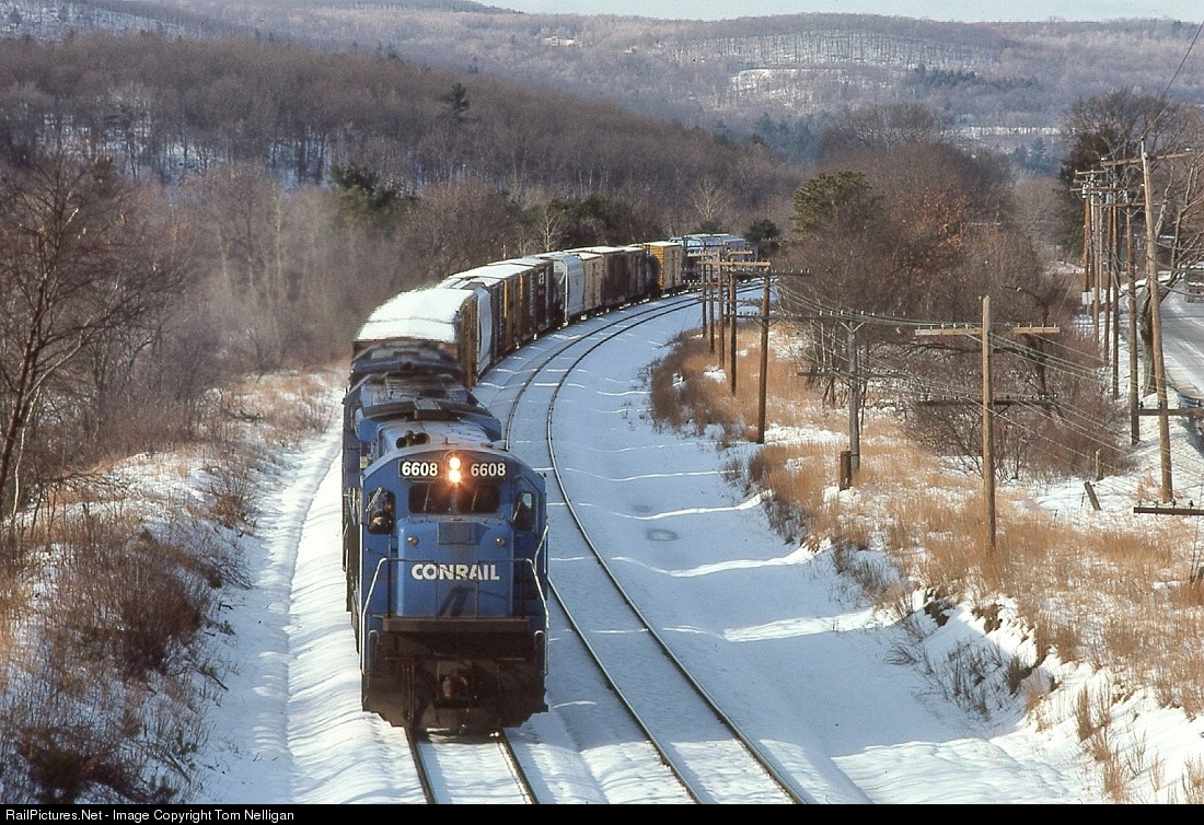 | On a crisp winter day, an eastbound Conrail freight with a trio of six-axle GEs climbs through the hills of central Massachusetts on the former Boston & Albany, headed for Boston's Beacon Park Yard. Lead unit 6608 was one of CR's ten C30-7s, which along with its litter mates was regularly assigned to the B&A. |