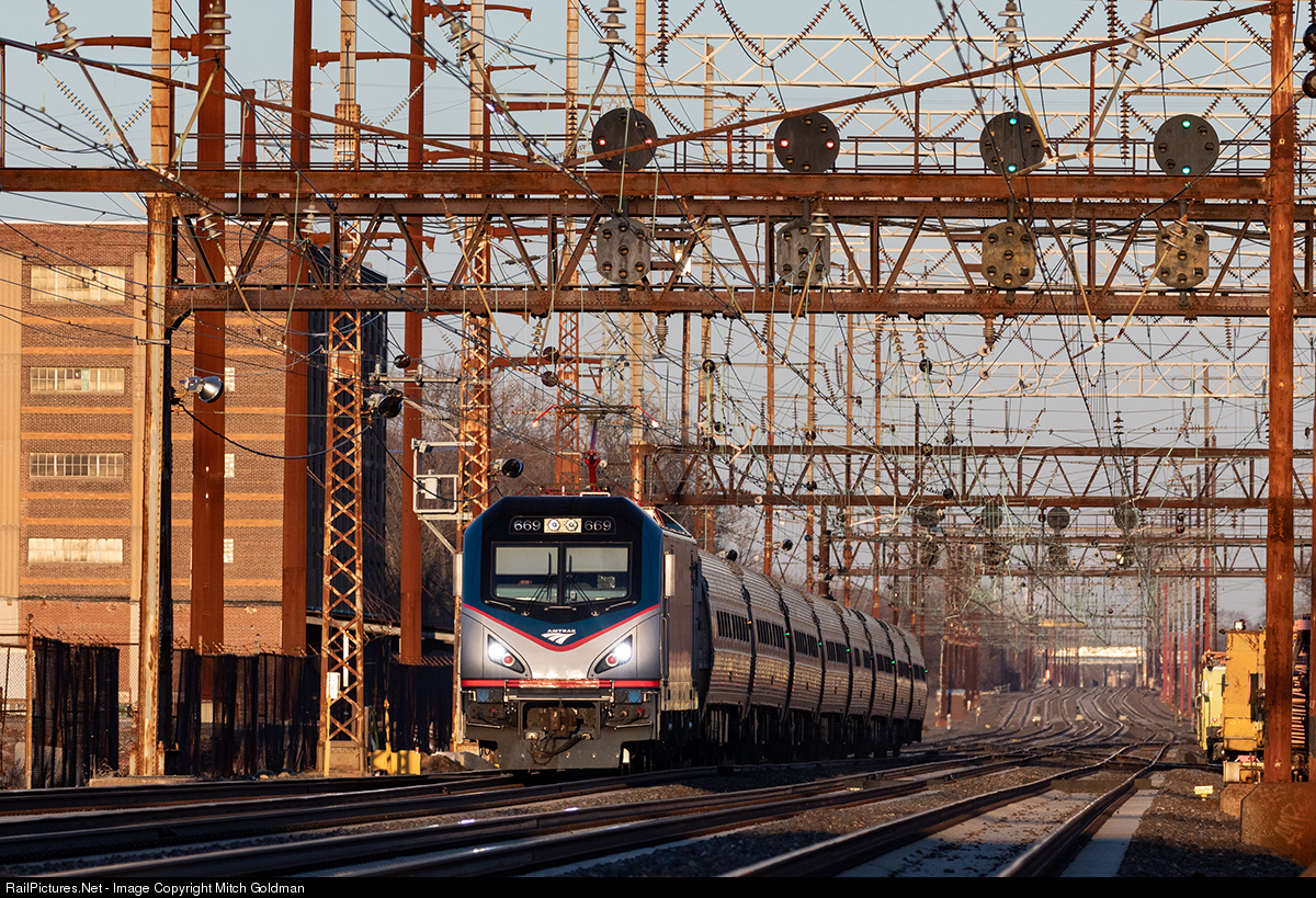 | A early evening Amtrak Regional Express catches the last light of day as it ducks the signal bridge, southbound through Marcus Hook, PA. |