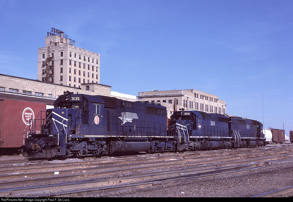 The view here is 100% Missouri Pacific Railroad, even if it was photographed 3 years after the UP-MP-WP merger date. 3 SD's off an inbound train are in the west end of #1 in Texarkana Yard, while system rolling stock sits in #106 behind the power. Track #106 was one of the former passenger station tracks that was occasionally used to store cars, high wide loads, and gang equipment. In the background the shells of the McCartney Hotel and Texarkana Union Station, both abandoned at the time, dominate the city skyline.