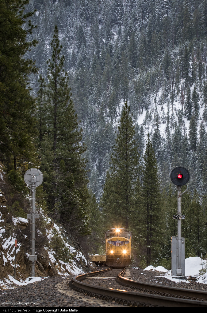 292.2 Miles From San Francisco. There are still traces of the Western Pacific Railroad hidden deep in the mountains of Northern California. Out here, searchlight signals still dominate the landscape, while throughout the rest of the country, they have been largely replaced. Just below the signal head, there is a milepost marker with "2922". This marker was originally installed by the WP and informs railroaders of their exact location. For the WP, everything was measured from the San Francisco Ferry Building. San Francisco was Mile Post (MP) 0, while Oakland was MP 4, Sacramento MP 139 and finally Salt Lake City MP 928. In this shot, a Union Pacific work train heads west along the old Feather River Route, splitting a pair of searchlight signals at Massack, 292.2 miles from San Francisco.