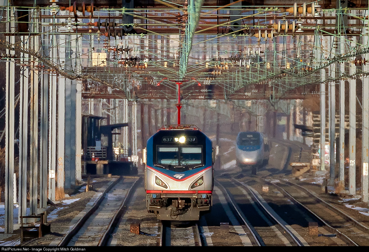| A westbound Amtrak Regional Express barrels past an eastbound Acela Express, captured here midway between North Elizabeth and Elizabeth stations. |