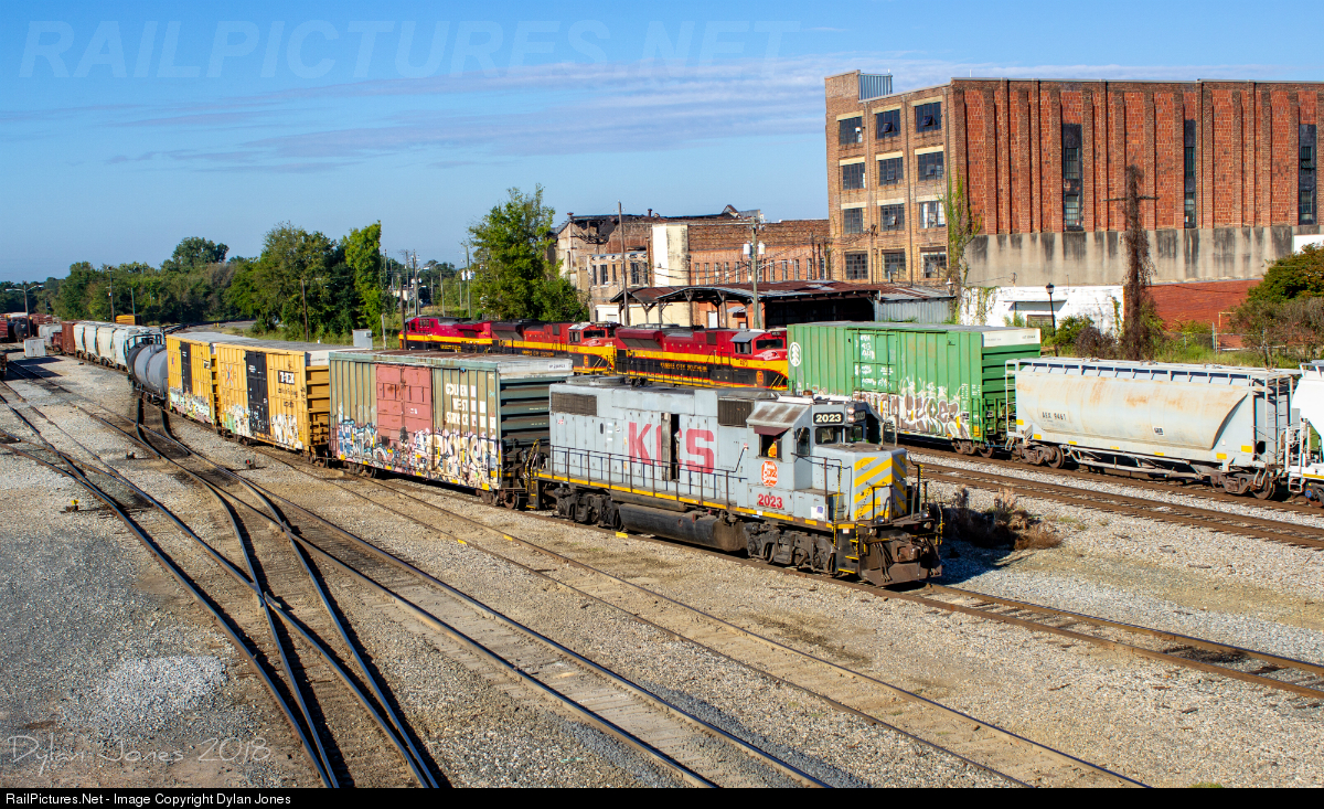 KCS GP38-2 #2023 moves a cut of cars to the north end of the yard so that outbound train M-NSJA, shown in the background can grab them and head west to Jackson, MS.