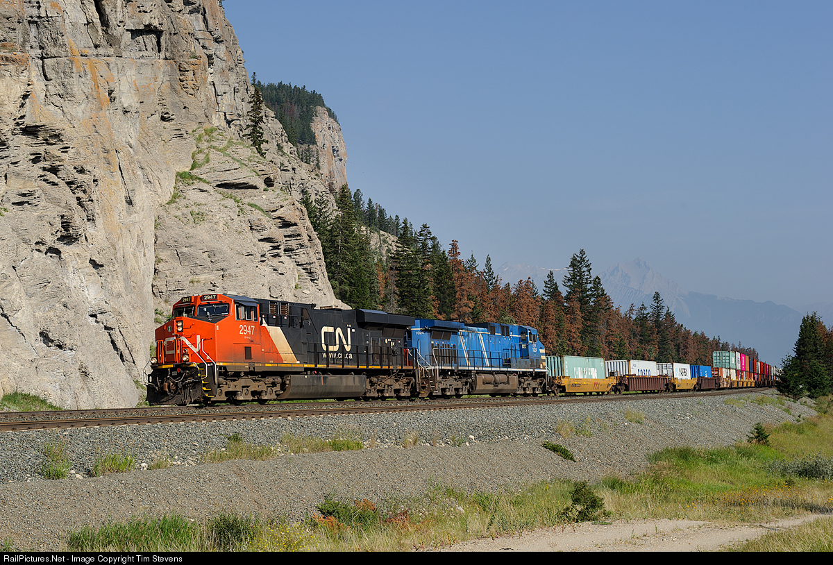 CN ES44AC 2947 and leased CEFX AC4400CW 1024 lead extra Detroit-Prince Rupert stacks into Jasper for a crew change.