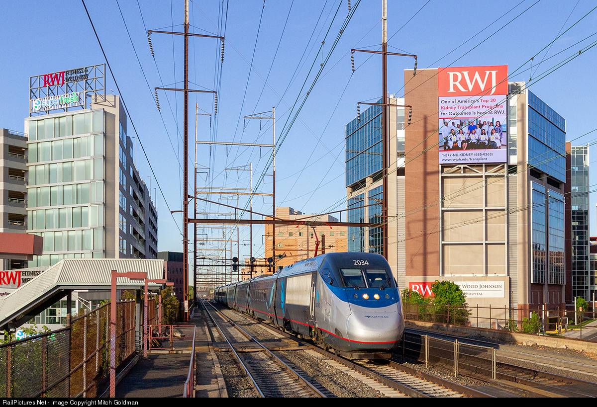 | An Acela Express races east through the heart of New Brunswick, NJ over the Pennsylvania Railroad built viaduct. The viaduct is a monument of engineering completed in 1903 to elevate the tracks above the bustling streets below. The buildings to both the right and left are those of the Robert Wood Johnson University Hospital. |
