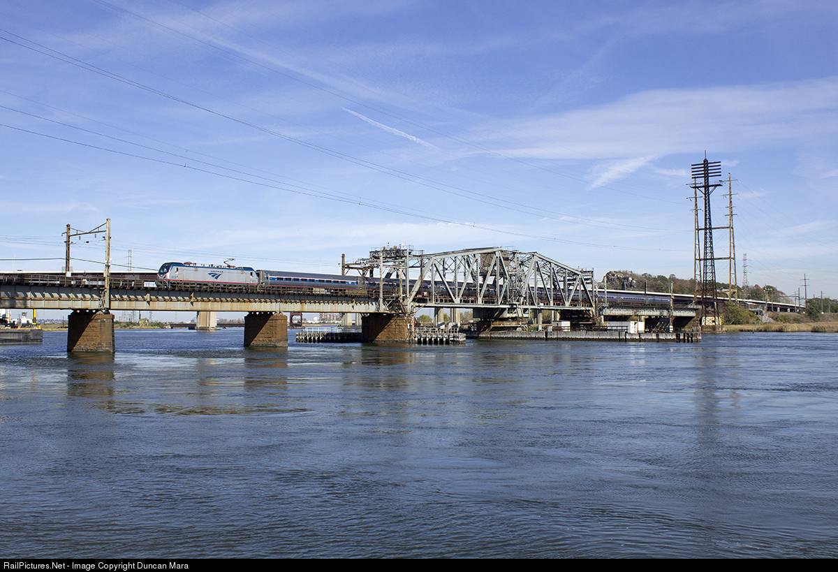 Amtrak Northeast Regional #99 crosses Portal Bridge in Kearny, NJ, upon departing New York Penn Station. Powered by ACS-64 #613, the train is still hours away from reaching its final destination of Newport News, VA. Portal Bridge is one of the largest "choke points" on the Northeast Corridor, and is planned to be replaced in the coming years.