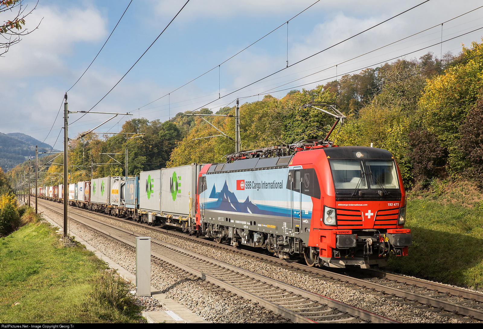 Siemens Vectron 193 # 471 "Karlsruhe" of leasing company LokRoll, rented to SBB Cargo International, is pulling southbound HUPAC intermodal train from Rotterdam Waalhavn (Rail Service Center Rotterdam) to Gallarate (Busto Arsizio Terminal) on the Bözberg line near Umiken.