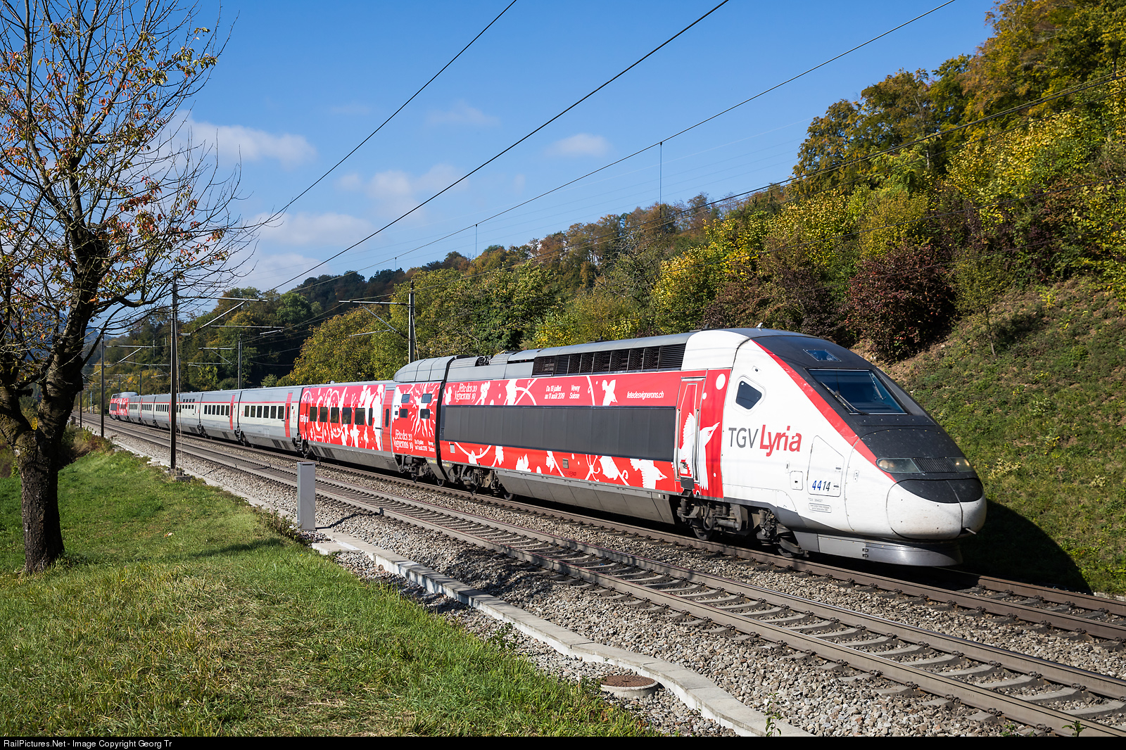| TGV POS # 4414 of Lyria, running TGV # 9203 from Paris Gare de Lyon to Zürich, diverted via the Bözberg line instead of Hauenstein on short notice, near Umiken between Villnachern and Brugg (AG). This trainset has a publicity paint scheme for the "Fête des Vignerons 2019" at Vevey. |