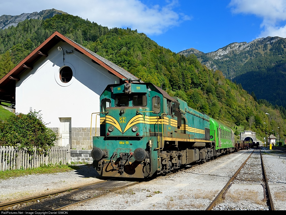 | On the line between Jesenice and Nova Gorica car shuttle trains are running through the longest tunnel in Slovenia. The trip through the tunnel lasts 10 minutes. The trains are hauled by diesel locomotives of the class 664. The JŽ 664 locomotives were a class of diesel locomotives operated by Yugoslav Railways. They are an GM-EMD export model of type EMD G26, subclass 664-0 was built by EMD, subclass 664-1 was built by Đuro Đaković from 1972 until 1984. After the breakup of Yugoslavia the locomotives were split. The 664-0 subclass were split between Croatia as HŽ series 2062 (60 units), and Serbia (5 units); the 664-1 subclass were transferred to the Slovenian Railways (as SŽ series 664), 20 units. The locomotives of the class 664 are nicknamed "Reagan" in Slovenia. |