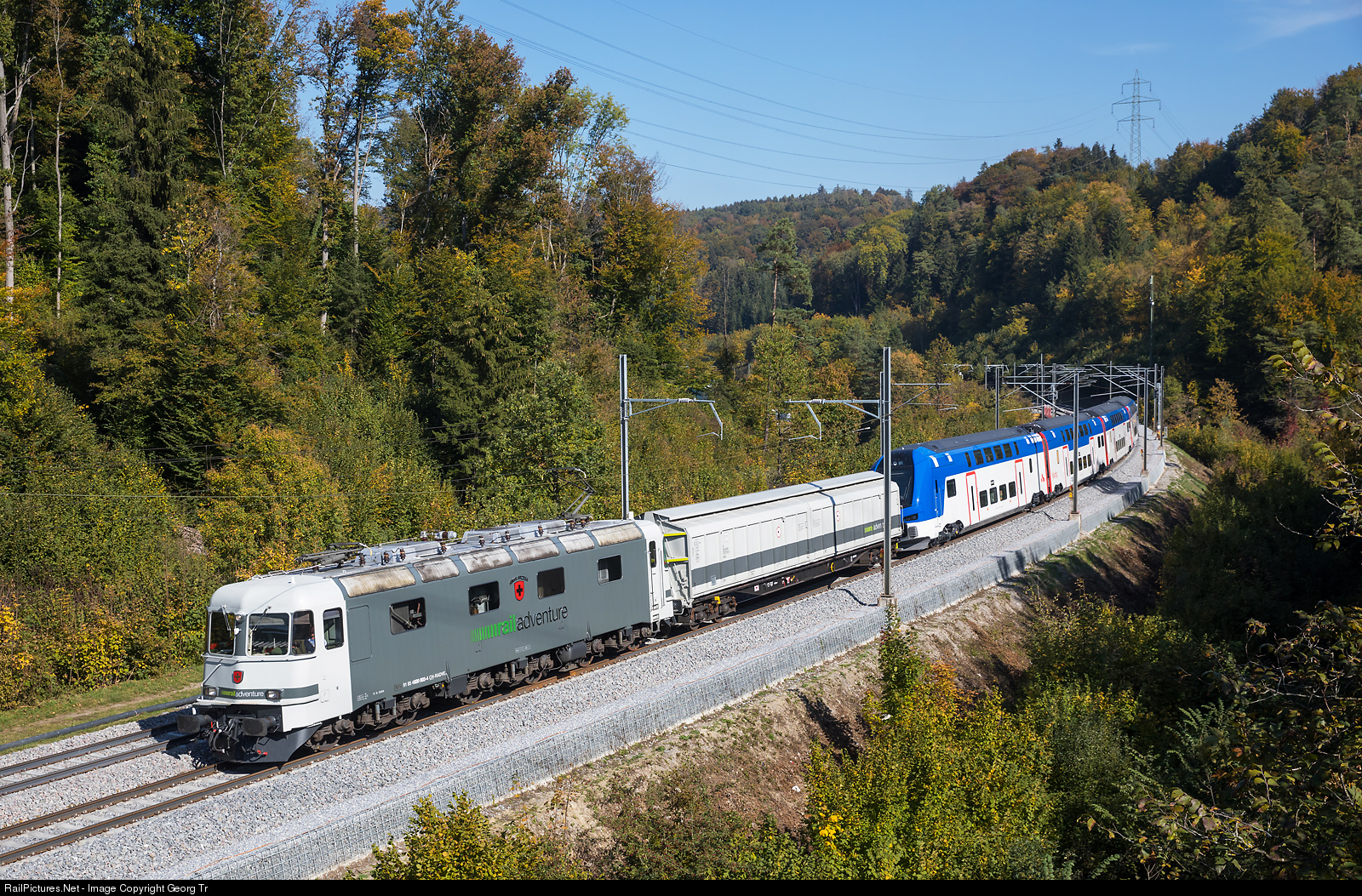 | Former SBB Re 6/6 # 11603, now running as Re 620 # 003 for the RailAdventure Gmbh, is pulling a new doubledeck intercity train from StadlerRail for the swedish Transitio (Mälartog) from Erlen to Basel, between Kemptthal and Effretikon. |