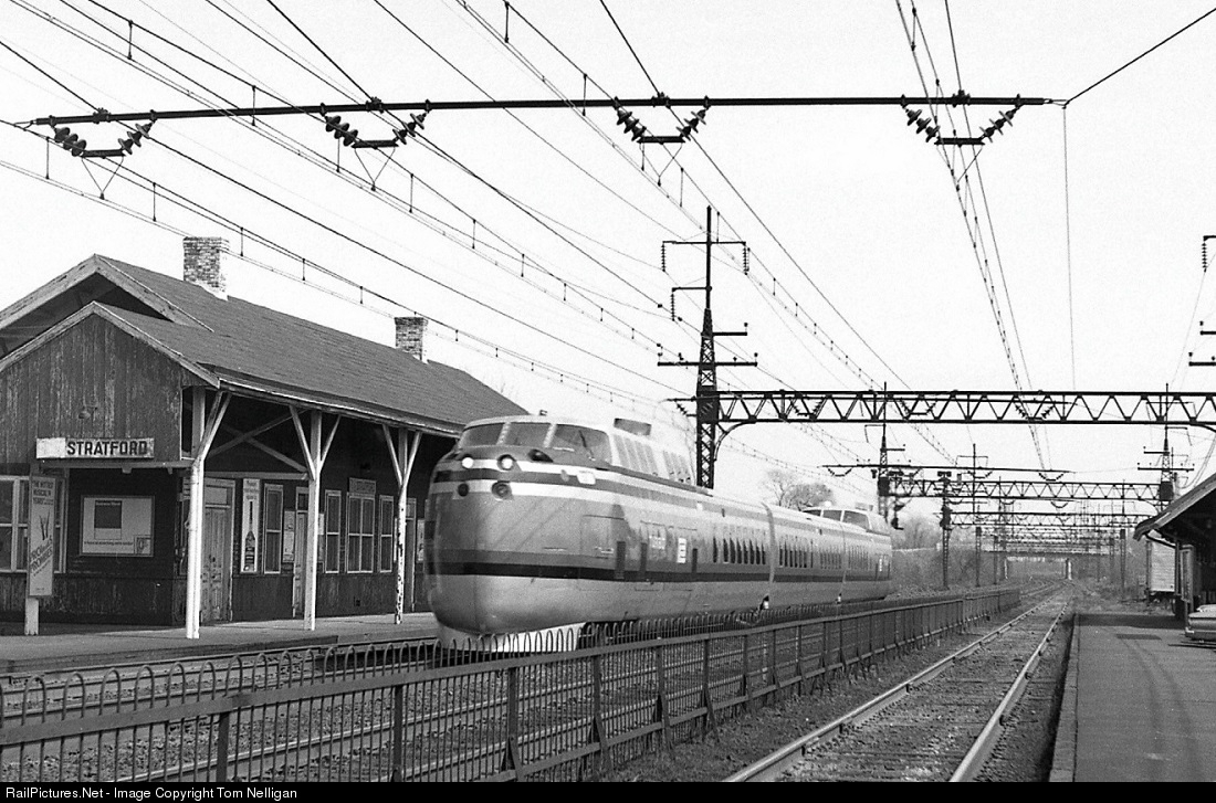 In its first weeks of revenue service for Penn Central, a United Aircraft TurboTrain that still wears its original DOT colors speeds through the station at Stratford, CT, bound for Grand Central Terminal on former New Haven trackage. These fast little trains carried high hopes in 1969 but they proved to be mechanically unreliable and were retired seven years later.