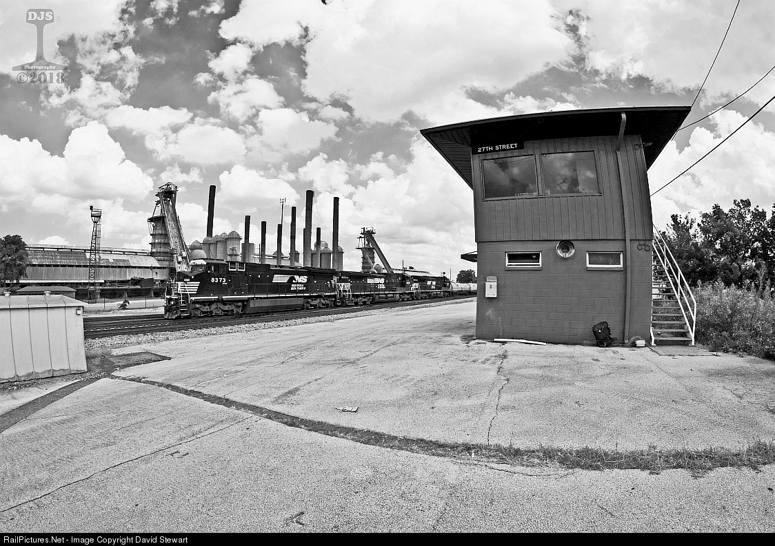 Mobile bound train, NS 183 steps by 27th Street interlocking and the long closed Sloss Furnace in the background at Birmingham, Alabama. Birmingham was once known into the 1970s as the Pittsburgh Of The South, but has long since lost that title, in fact 183 is heading to Mobile where it's empty coil steel cars will be loaded at the port with imported coil rolls. The 27th Street tower closed in the early 2000's and now serves as a storage unit for the Signal Department. Sloss Furnace is now a National Historic Landmark. October 6, 2018
