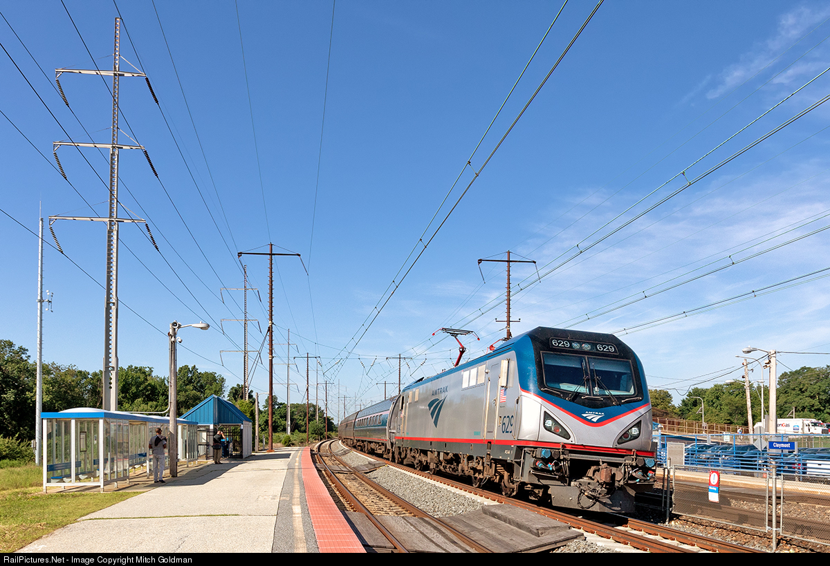 | An Amtrak Regional Express led by ACS-64 No. 629 rounds the super-elevated curve on the express track through Claymont station in Delaware. Sometime in 2020, this station will be replaced with the Claymont Regional Transportation Center located off the curve 1⁄2 mile north of the current station at the former site of Evraz Claymont Steel. |