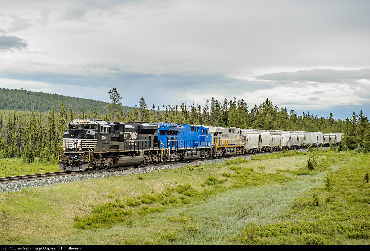 With an absolutely bonkers motive power consist, Swan Landing-Grande Prairie train A458 heads north on the Grande Cache Sub with 102 sand loads. This might be the first time an NS unit has operated on these rails, let alone leading. NS SD70ACe 1108, GECX ET44AC 2033 and CREX ES44AC 1515 are up front, while CREX ES44ACs 1512 and 1514 were assisting on the rear.