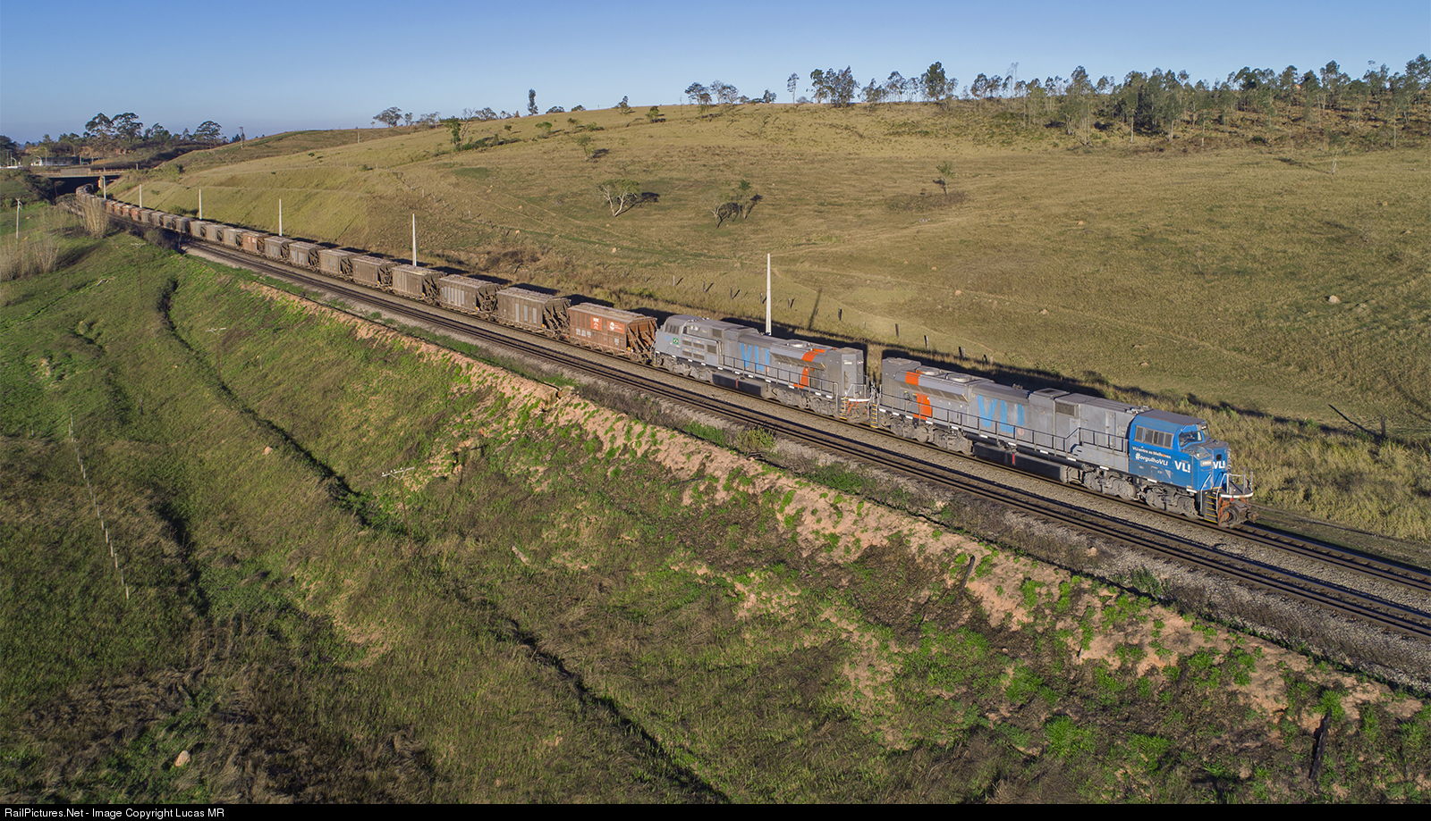 | Northbound empty VLi U69 standing by for crew change at GuaianĂ£ yard. As the crew take a long to be changed, we had the opportunity to take this picture from the air. |